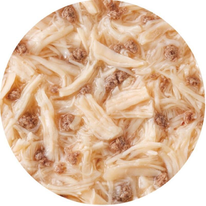 鶏肉(ささみ)、牛肉、酵母エキス調味料、でん粉、和牛エキス、増粘安定剤(加工でん粉、増粘多糖類)、ビタミンE、カラメル色素、緑茶エキス