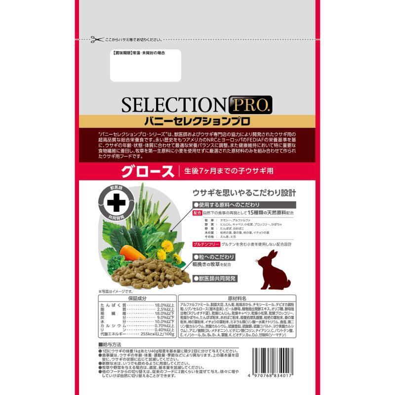 アルファルファを主原料に、成長期の子ウサギに必要な栄養素をバランスよく配合。